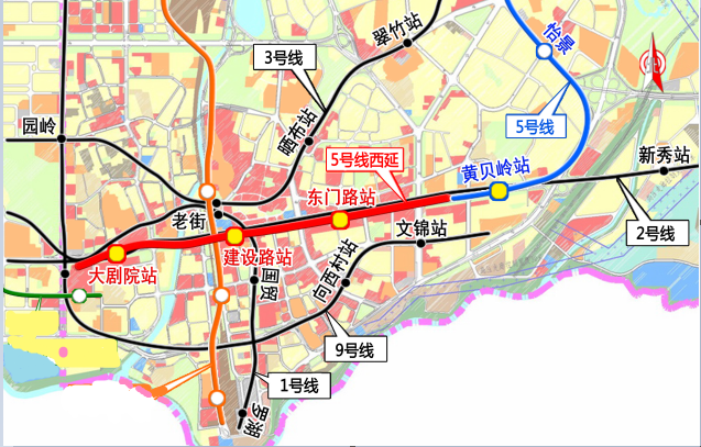 3、項(xiàng)目規(guī)模:5號(hào)線工程(黃貝嶺站后至大劇院段)全線位于羅湖中心區(qū)內(nèi),起自5號(hào)線一期工程黃貝嶺站,終至大劇院站,線路全長(zhǎng)2.871km,全線采用地下敷設(shè);共設(shè)車站3座(其中換乘站1座,大劇院站與1、2號(hào)線換乘),平均站間距為0.838km。